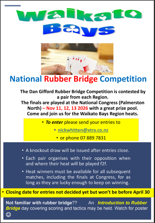 Please see the attached Rubber Bridge Poster for this year's knock-out rubber competiton. Entries will remain open until 30-April earliest. A draw will be published by organiser Nick Whitten about then